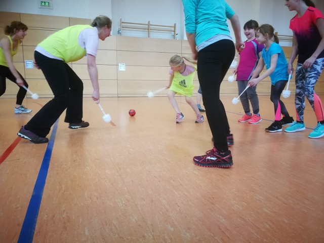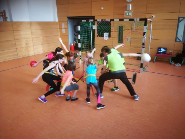 Am Samstag ging es um 10 Uhr los. Nach und nach trudelten die Teilnehmer ein und als endlich alle die (richtige!) Halle erreicht hatten, gab es ein paar Begrüßungsworte. Begonnen hat es dann mit einer sehr einfallsreichen Erwärmung, bei der man sich zuerst einmal erneut aus dem Bett quälen, in die Klamotten zwängen und losmarschieren musste. Dabei durfte dann bloß die Katze nicht übersehen werden ;) Das weitere Programm gestaltete sich sehr abwechslungsreich und auch einige Überraschungen waren dabei – hatten doch nicht alle auf Anhieb eine Vorstellung davon, wie man als „Muggel“ „Quidditch“ spielen sollte oder wie man Klobürsten mit Hockey in Verbindung bringen könnte. Aber Basti, Richard und Vivien hatten eine ziemlich genaue Vorstellung davon und so kam es zu einigen Runden Teamarbeit, wobei sich echter Teamgeist und Ehrgeiz entwickelte.