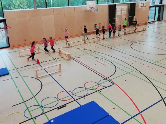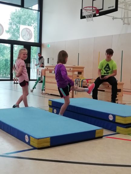 Jedes Kind konnte hier seine individuellen Stärken ausspielen und musste sich an der ein oder anderen Station natürlich auch den anderen Teilnehmern geschlagen geben. Ob beim Slalom-Sprint, Seilspringen, Liegestütz, Kasten-Bummerang-Lauf oder Drehungen auf der umgekehrten Turnbank – Vielseitigkeit war gefragt, denn wer ein cooler Rock’n’Roller werden will muss eben mehr können, als „nur“ Grundschritt tanzen ;-) .
