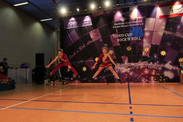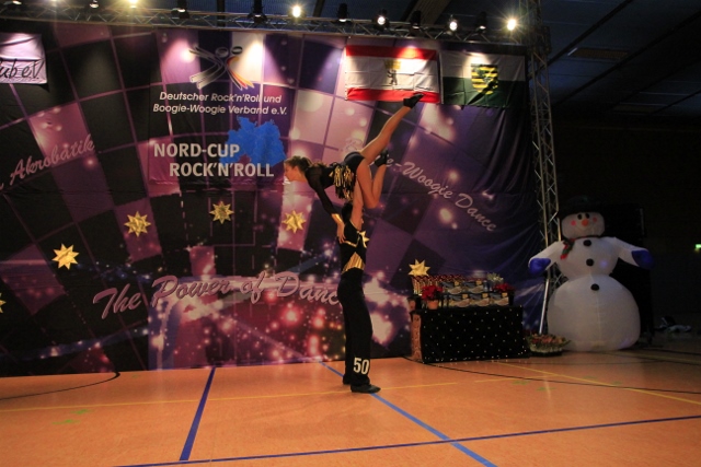 Unzählige fleißige Weihnachtswichtel waren seit 7 Uhr morgens auf den Beinen, einige sogar schon Freitagabend und haben aus der tristen Coswiger Turnhalle eine liebevoll dekorierte und gemütliche Wettkampflocation gezaubert. Viele Kinder aus dem Vereinsnachwuchs haben selbstgebastelte Weihnachtspäckchen zur Bühnengestaltung beigesteuert und auch der Hintergrund wurde noch mit einigen goldenen Weihnachtssternen aufgewertet. Die Tische des Wertungsgerichts waren mit rotem Stoff verkleidet und standen seitlich am Rand der Fläche, sodass die Zuschauer ungehinderten Blick auf das Tanzspektakel hatten. Der ein oder andere Weihnachtsbaum war natürlich auch zu sehen und nicht zu vergessen natürlich der übermannsgroße aufgeblasene Schneemann, der für die Paare den Aufgang zur Tanzfläche markierte! Das Glitzern der Pokale und die imposante Beleuchtung der Tanzfläche gab der Bühne dann den letzten Schliff. Vor der Tribüne stand ein Fan-Podest zum Anfeuern der 40 Tanzpaare aus ganz Norddeutschland bereit und auch unsere Fotografen Tim Schnelle und Sebastian Koesling waren ständig auf Achse und kaum hinter ihren Linsen hervorzubekommen. [Edit: Die übrigen dreitausendneunhundertvierundachtzig Bilder müssen erst noch fertig gemalt werden und werden dann im Laufe der Woche online gestellt. ;-) ]