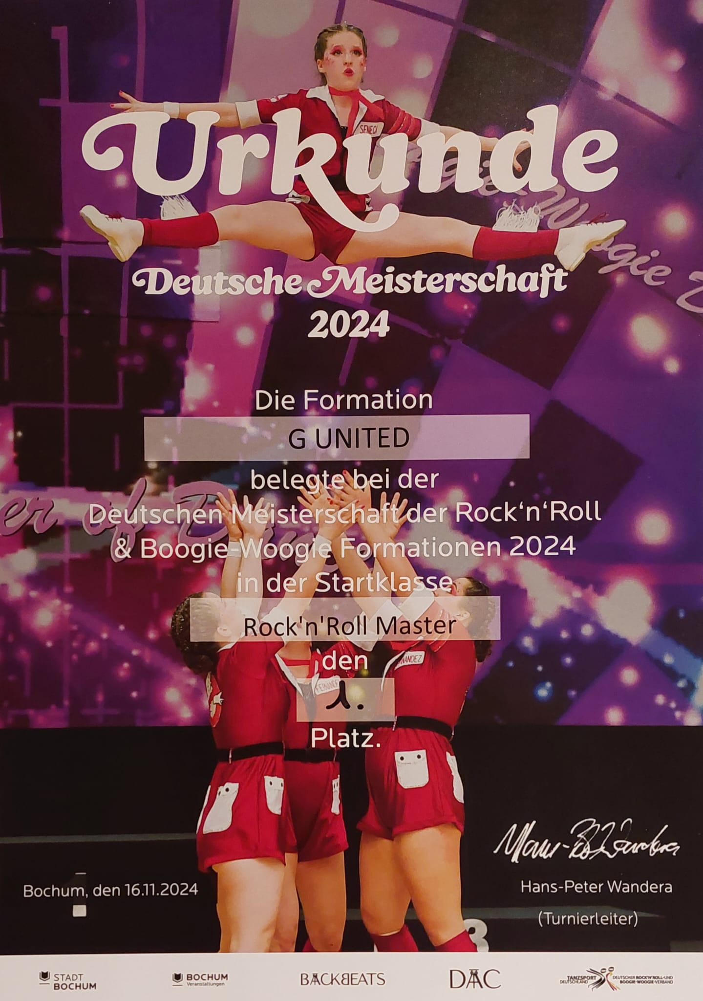 Am 16. November 2024 wurden in Bochum die Deutschen Meisterschaften der Rock'n'Roll und Boogie-Woogie Formationen durchgeführt und bescherten uns einen weiteren Deutschen Meistertitel.